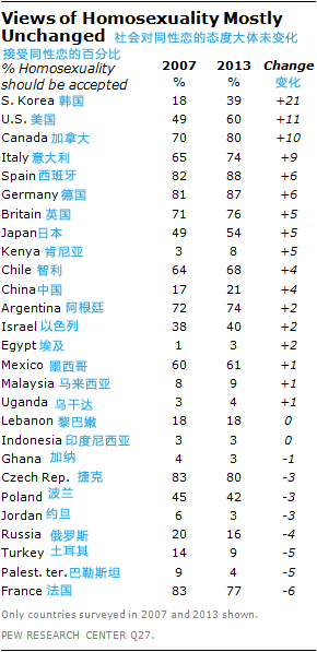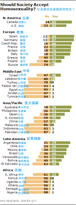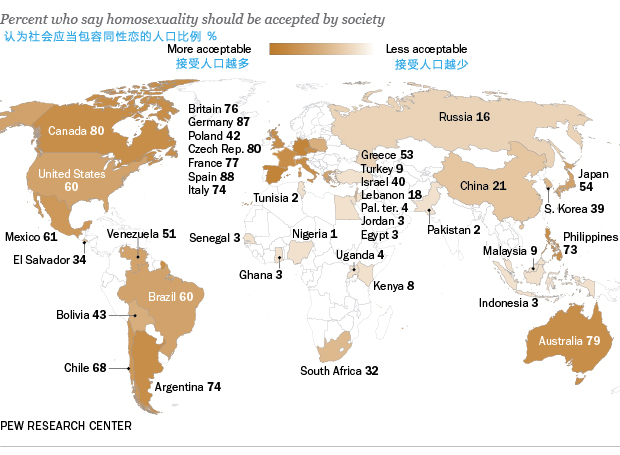 相关链接: 调查报告:《世界范围内关于同性恋的意见分歧》《The Global Divide on Homosexuality