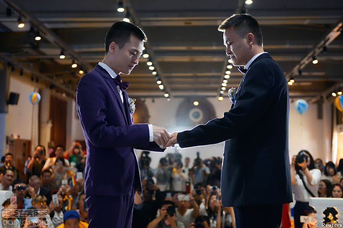 今年5月17日,在长沙,一对男同性恋者站到聚光灯前,互相交换戒指,当众拥吻,成为"夫妻”。虽然这场婚礼不受法律支持。
