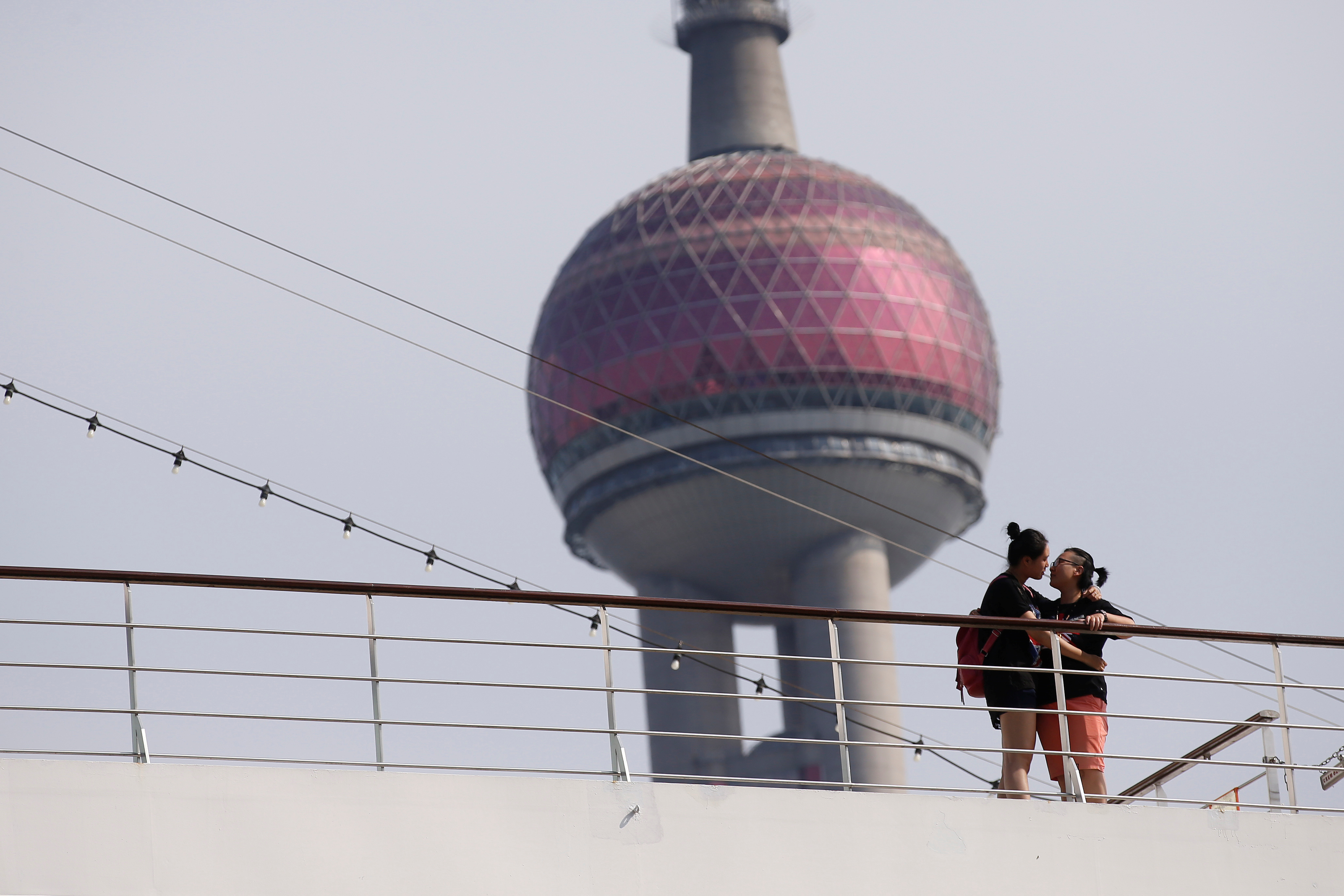 2017年6月,正在上海一艘游船上拥抱的同性伴侣。/Reuters