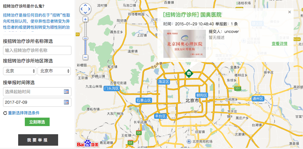 根据"Uncover-同志友善地图"的不完全统计,截至2017年7月2日,这样的扭转治疗诊所至少有46家。从百度搜索的结果来看,能够提供"扭转治疗"的"诊所"和"心理治疗师"则远远超出瞭Uncover的统计结果显示的数量。