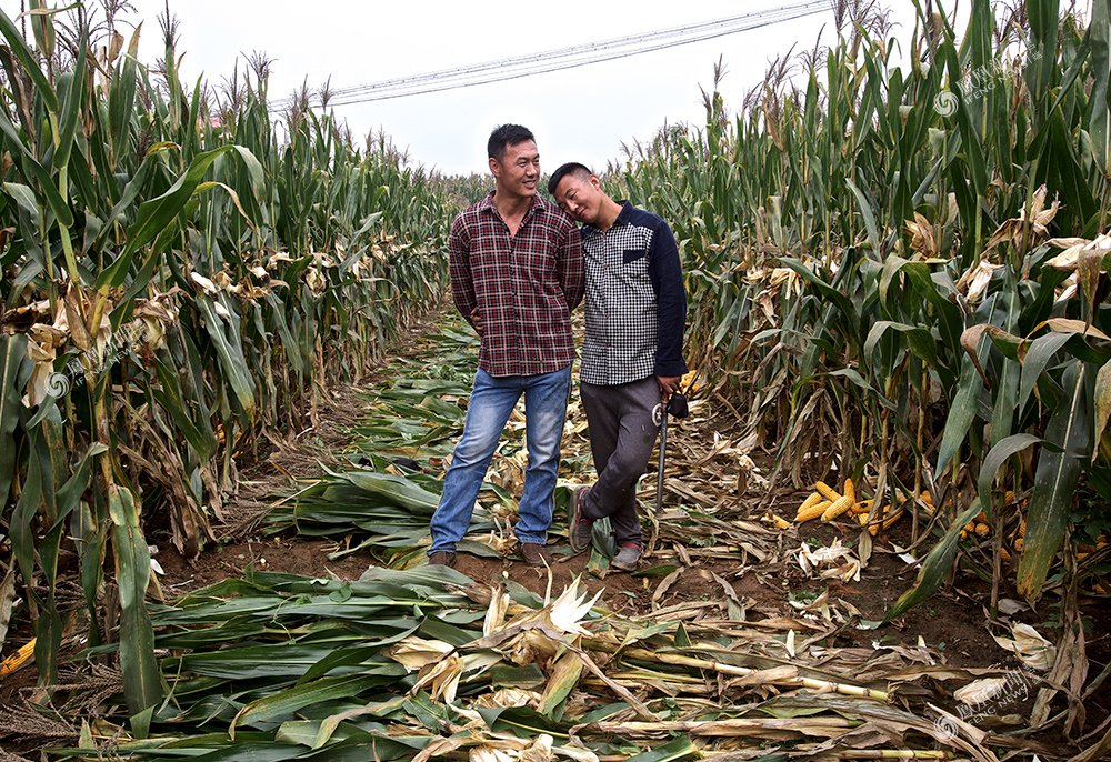 2014年9月21日,河北行唐县,烨斌斜倚着爱人安伟,站在自家等待收割的玉米地里。这对同性爱人,已经共同在这个小乡村里生活瞭三年有余。/《特刊》冯中豪