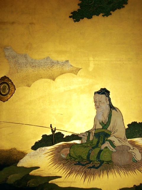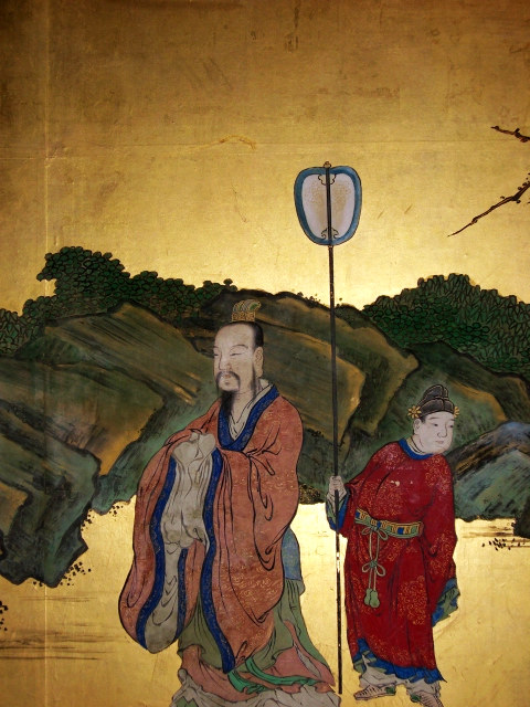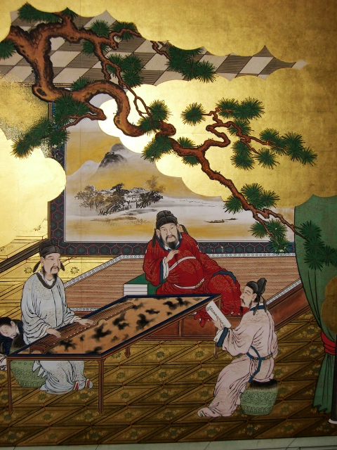 拉门画细节,青松下中国文人正在抚琴读诗书。这些精美的画板都是江户时代的真迹。
