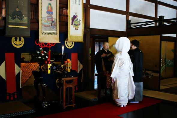 顺便说一句,很多人看日剧可能对日本传统婚礼里,新娘穿一身白素映像深刻。当然,如果两个女生,你们可以选择租借寺庙的"白无垢"和服与假发,两个男生也可以穿传统和服。但是春光院特别声明对衣着没有特别要求。你可以穿和服,也可以穿西式服装,总之庄重得体就好。