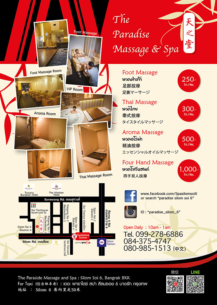 我住在同志聚集的曼谷繁华区域Silom路,这里有无数的同志酒吧和按摩店。我选择6巷里的一家新店,英文名是"The Paradise Massage & Spa"。让我惊讶的是,这家店还有个中文Logo,叫作"天之堂",中国游客的巨大影响力可见一斑。