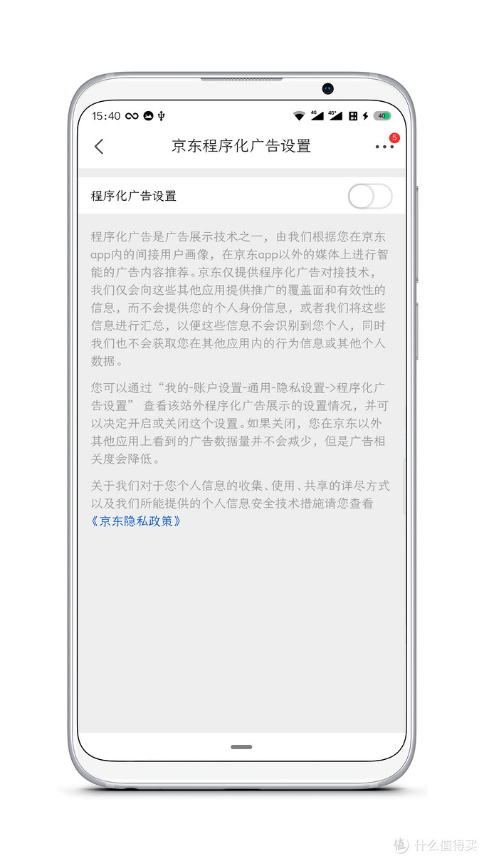 “程序化广告是广告展示技术之一,由我们根据您在 app 内的间接用户画像,在 app 以外的媒体上进行智能的广告内容推荐。”