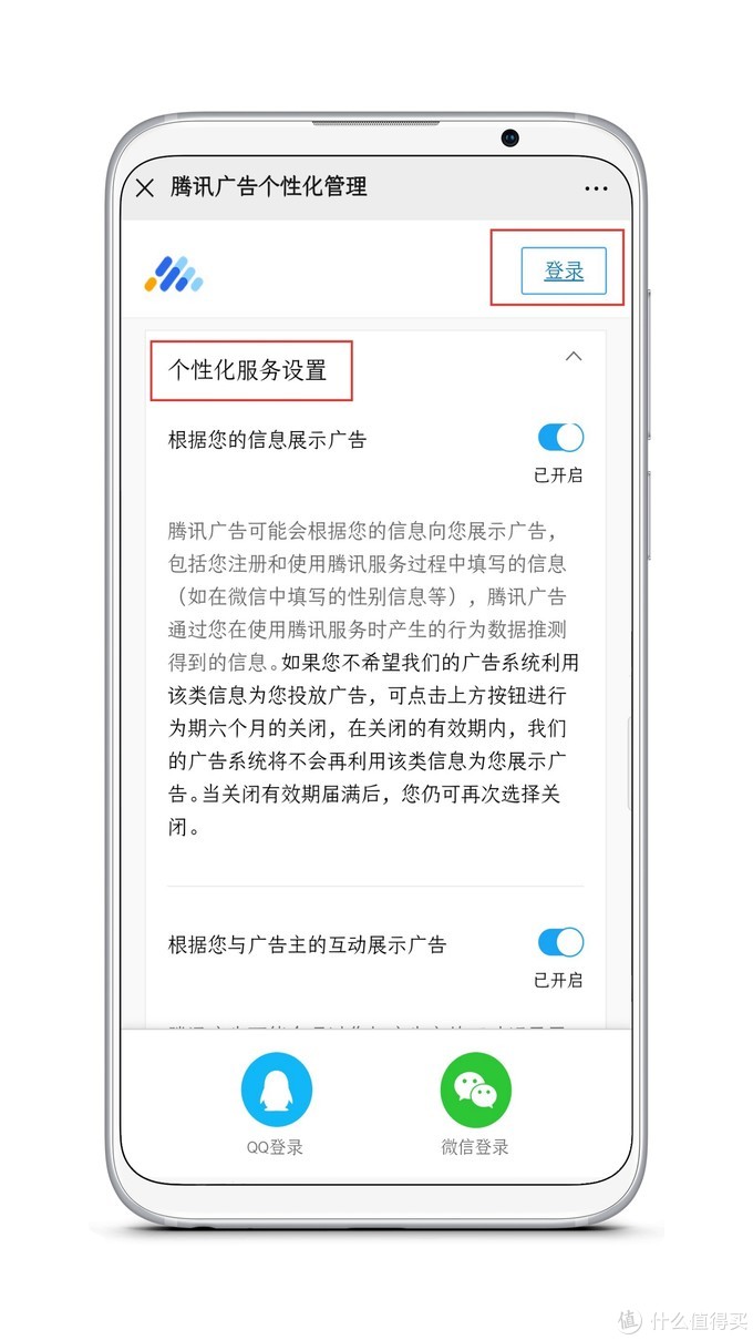 6. 点击右上角的登录,分别登录微信和 QQ,再将 “个性服务设置” 中的所有开关都关闭就可以啦